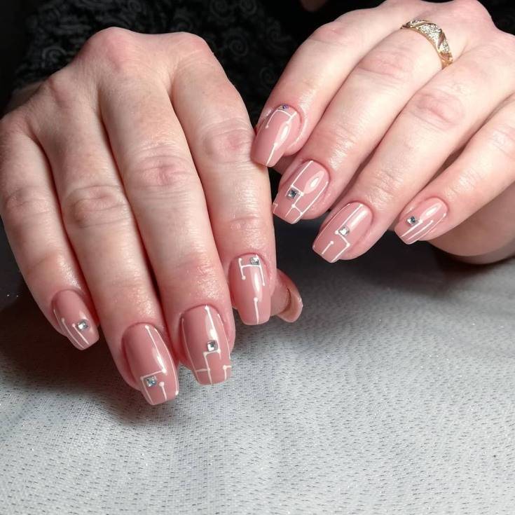 Современный дизайн ногтей с бежевым гель-лаком и геометрическими рисунками