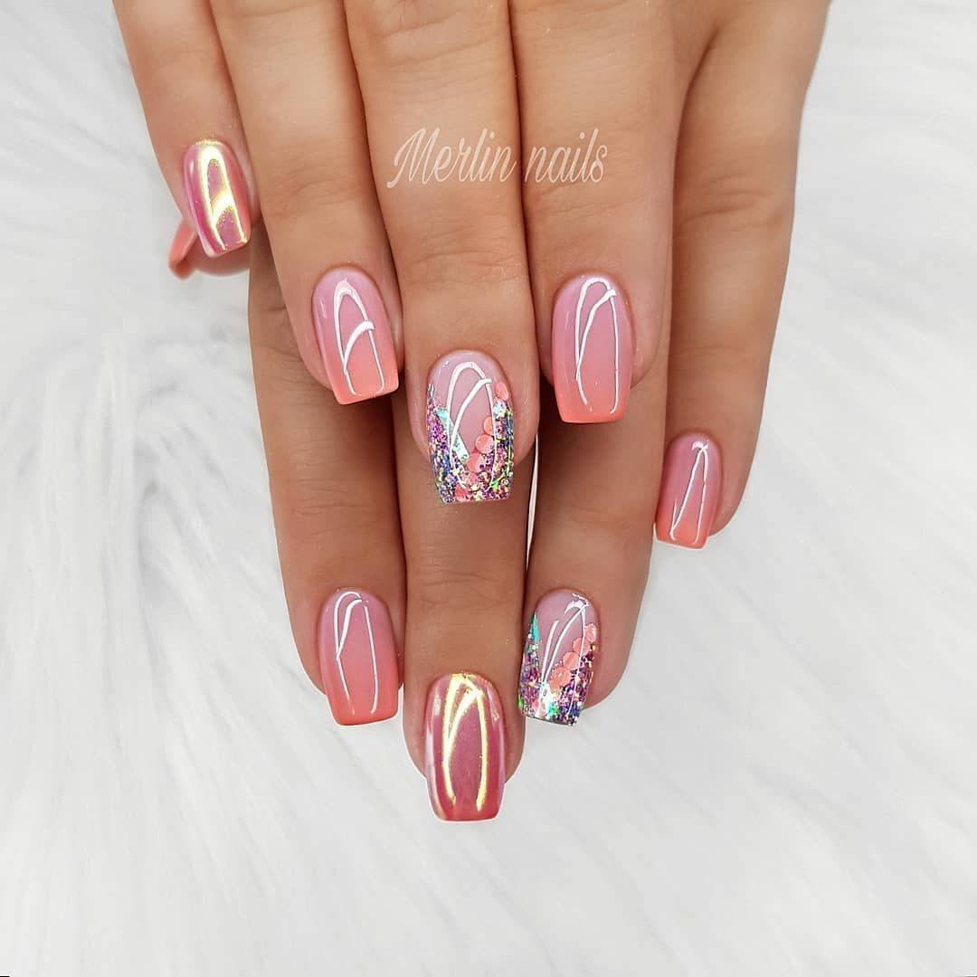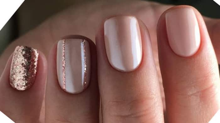Бежевый и розовый смотрятся также нежно и воздушно, как и голубой маникюр. Сочетание бежевого и розового на первый взгляд кажется пустым и слишком светлым, поэтому многие нейл-мастера добавляют в дизайн блестящие детали в виде стразов, бульонок, глиттера, фольги.