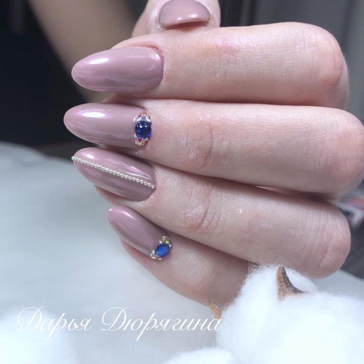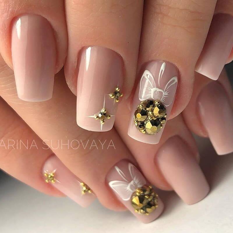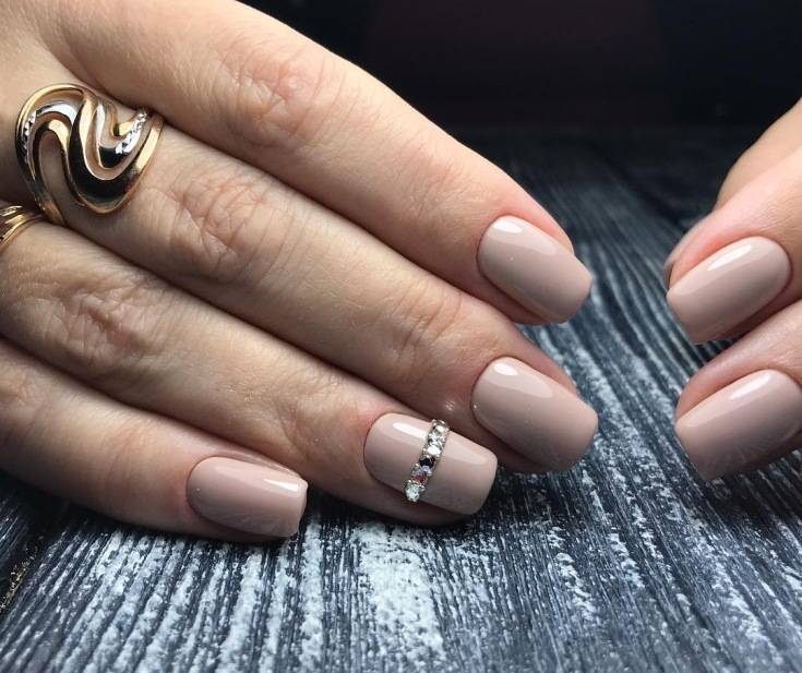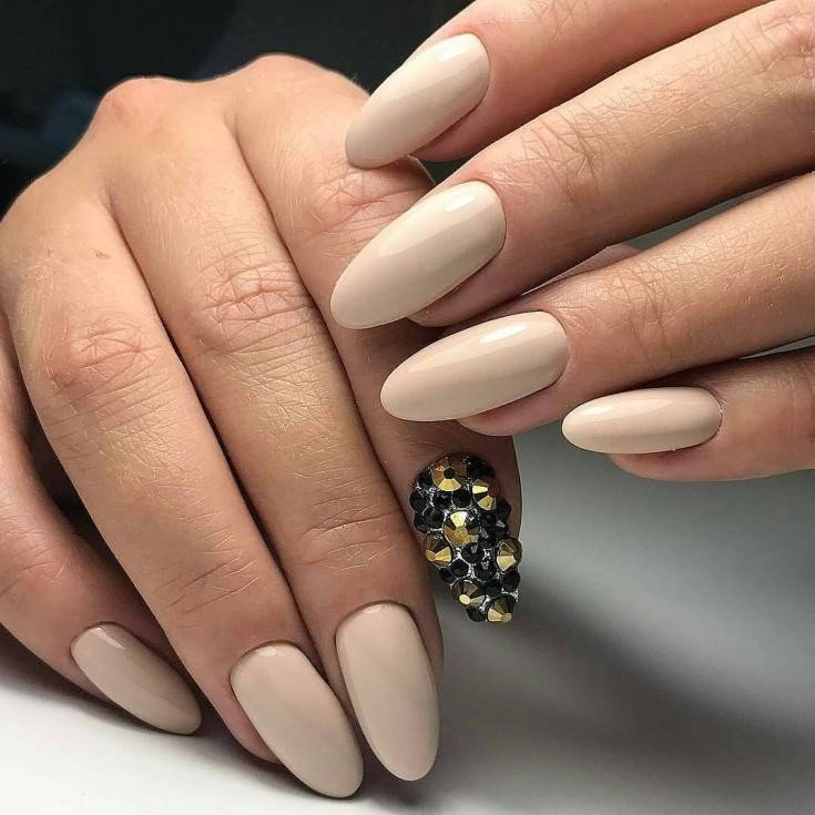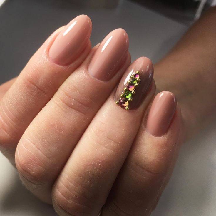 Куда же без этих украшений! С блесками и стразами бежевый маникюр смотрится ярко и эффектно. Но результат напрямую зависит от количества размещенных блесточек и страз. Чем больше их на ноготке, тем смелее можно утверждать, что маникюр претендует на звание праздничного.