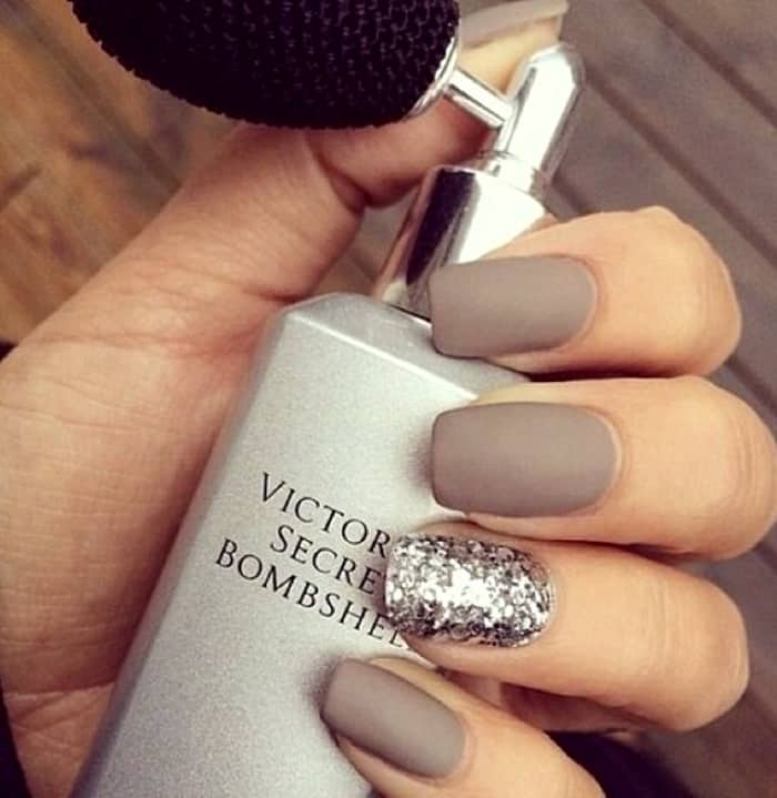 Пастельный маникюр на коротких ногтях в сером цвете позволит подчеркнуть индивидуальность стиля. В этом сезоне стилисты предлагают использовать матовое покрытие. Оно смотрится эффектно, необычно и элегантно. Если вы собрались на светский раут, добавьте к такому покрытию немного блеска и вы получите роскошный дизайн, который подойдет к любому вечернему наряду.