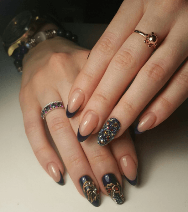 Яркие камни и небольшие бусинки золотого оттенка — неисчерпаемое поле для самых разных нейл-артов. Они могут быть строгими по форме или неповторимыми на каждом ноготке. Конечно, не стоит перегружать ежедневный маникюр обилием страз. А вот для праздничного можно выбрать любой из вариантов декора.