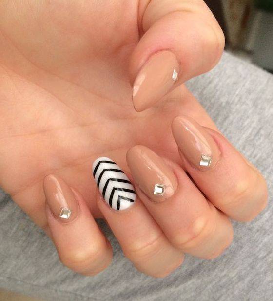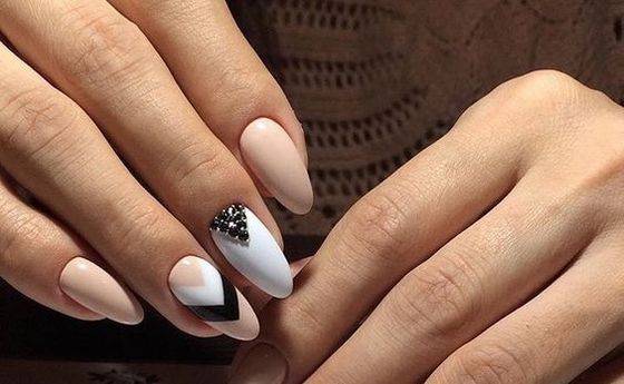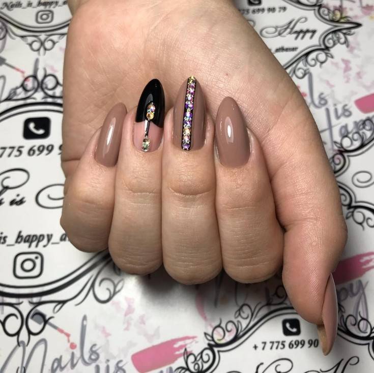 Нежный бежевый оттенок принято сочетать со строгим черным цветом. Такой макияж получается невероятно эффектным и элегантным. Нейл-дизайнеры предлагают сразу несколько способов сочетания этих цветов: