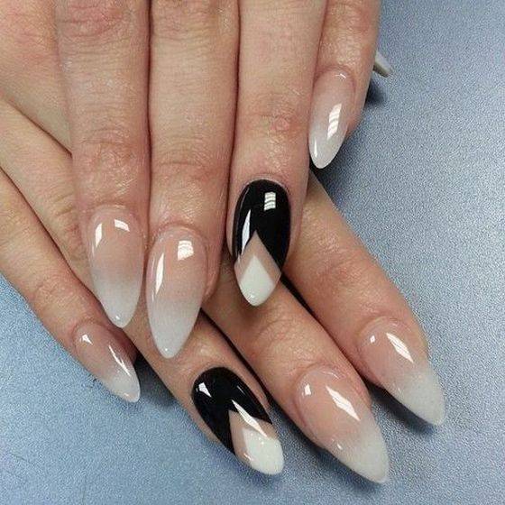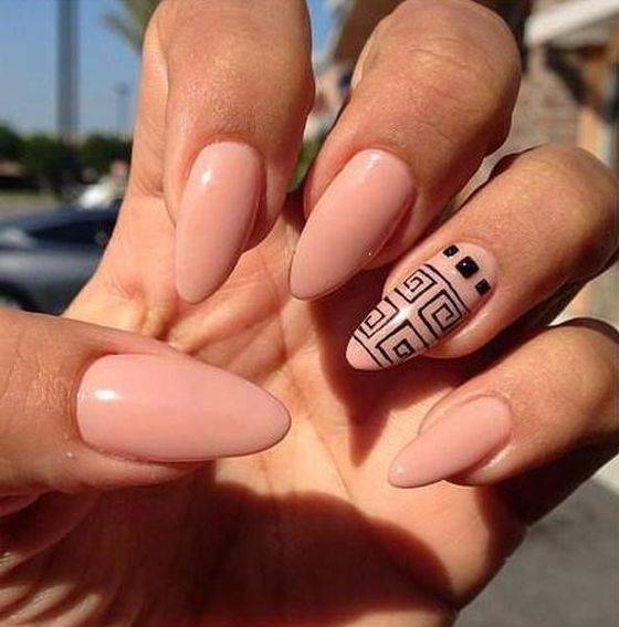 Острые ногти сами по себе смотрятся достаточно заметно и вызывающе, поэтому стоит использовать на них сдержанный и лаконичный дизайн. Чаще всего обладательницы острых длинных ногтей предпочитают однотонные нейл-арты в светлых оттенках: розовом, кремовом, сером, молочном. Не исключены варианты с черным и бордовым гель-лаком. Они также дополняются стразами, кристаллами Пикси, бульонками.