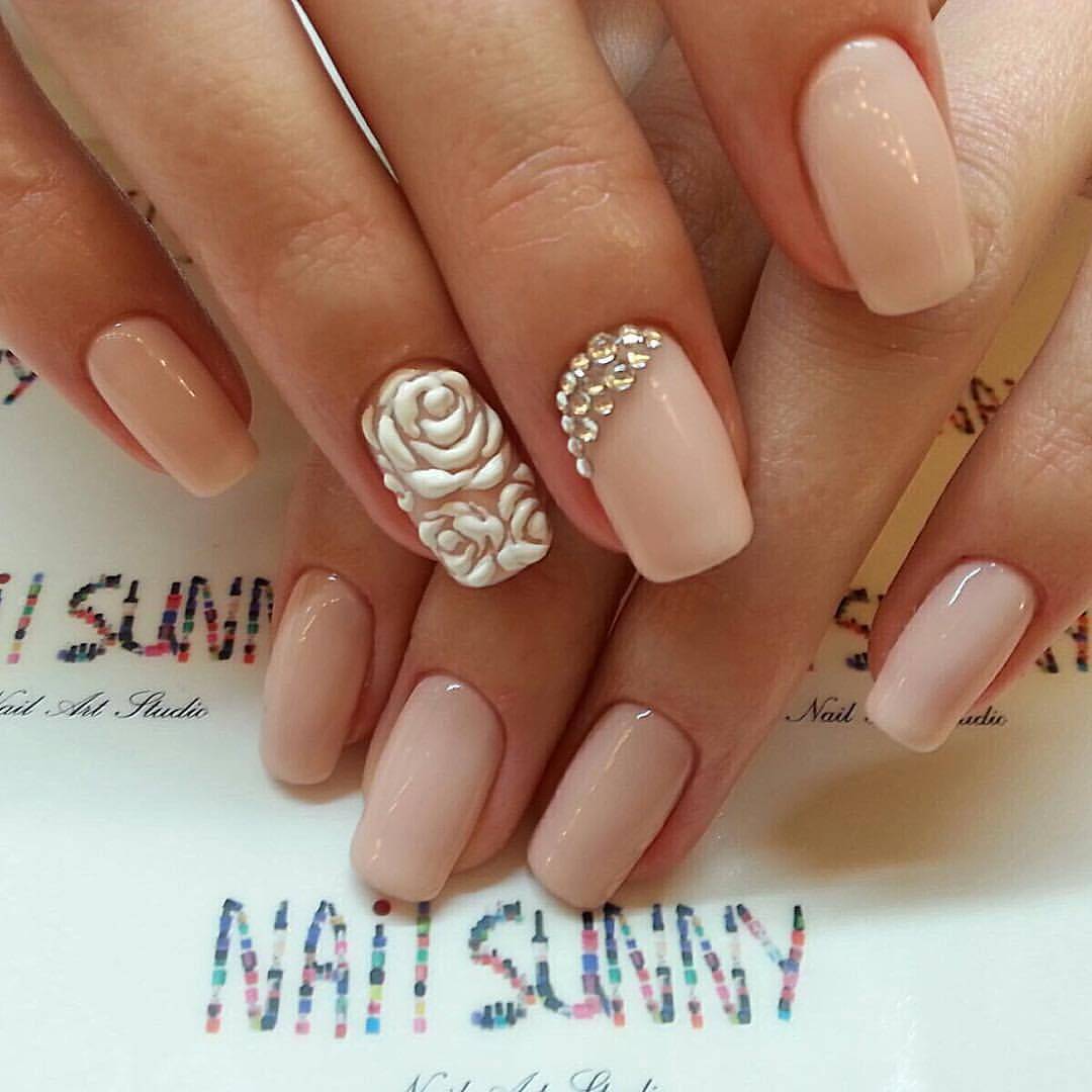 Идея оформления бежевого маникюра с одновременным использованием объёмных стразов и блёсток не только придётся по вкусу любительницам броских дизайнов, но и станет идеальным дополнением любого вечернего или праздничного образа, будь-то вечеринка в честь празднования Нового года, свадебная церемония или выпускной вечер. Беж – это универсальное цветовое решение.