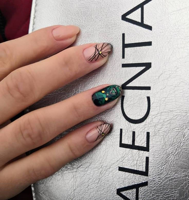 Любительницам лаконичного дизайна определенно придется по вкусу маникюр с “мазками кистью”. Это небольшие полоски, нанесенные на ногтевую пластину в другом цвете. Они прерывистые, что и делает их чуть более необычными. В сочетании с блестками такой маникюр выглядит свежо, стильно. При желании можно комбинировать данный рисунок с геометрическими или флористическими мотивами, паутинкой и другим декором. Это позволяет создавать большее количество рисунков на любой вкус.