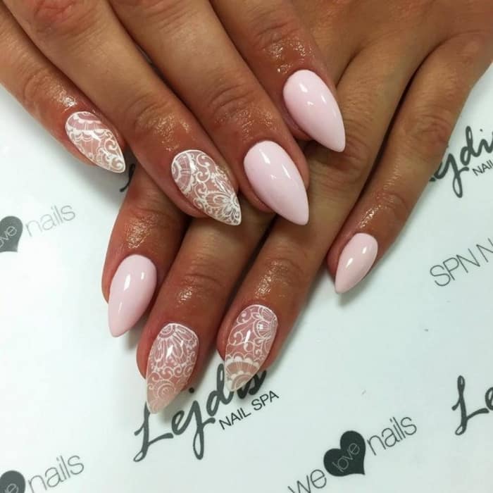 Кружева всегда являлись символом женственности. На однотонном покрытии можно нарисовать рисунок, имитирующий изящное кружево. Для выполнения такого дизайна требуется определенный уровень мастерства, поэтому в магазинах можно купить специальные трафареты, на которые наносится черный лак.