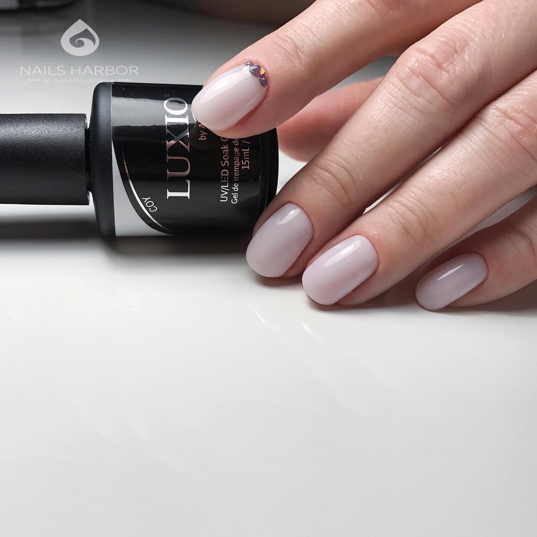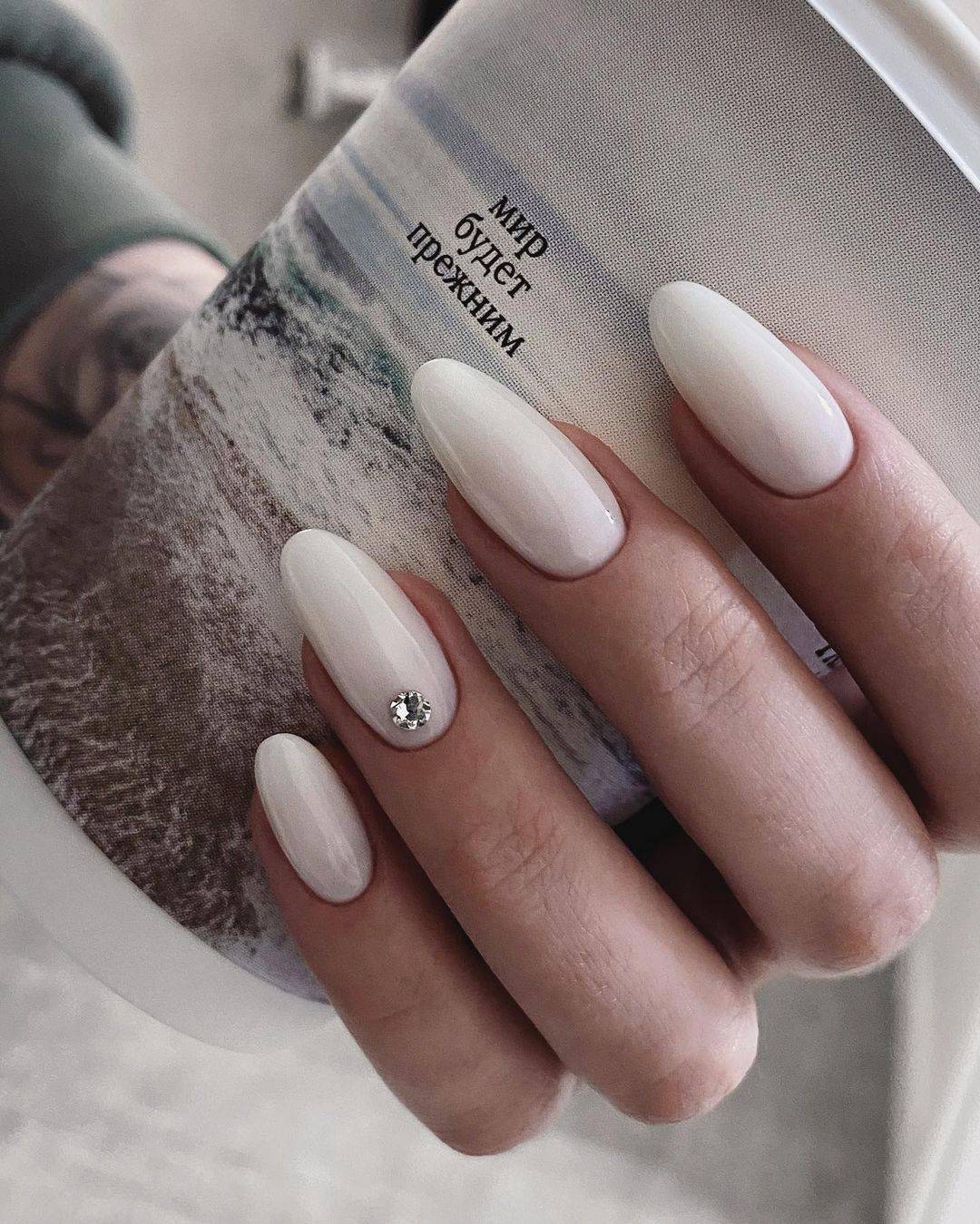 Светло-бежевый маникюр превосходно смотрится на длинных ногтях, создавая образ элегантной и деловой женщины. Для таких ногтей подойдут абсолютно все стразы светлого оттенка любых формы и размера.