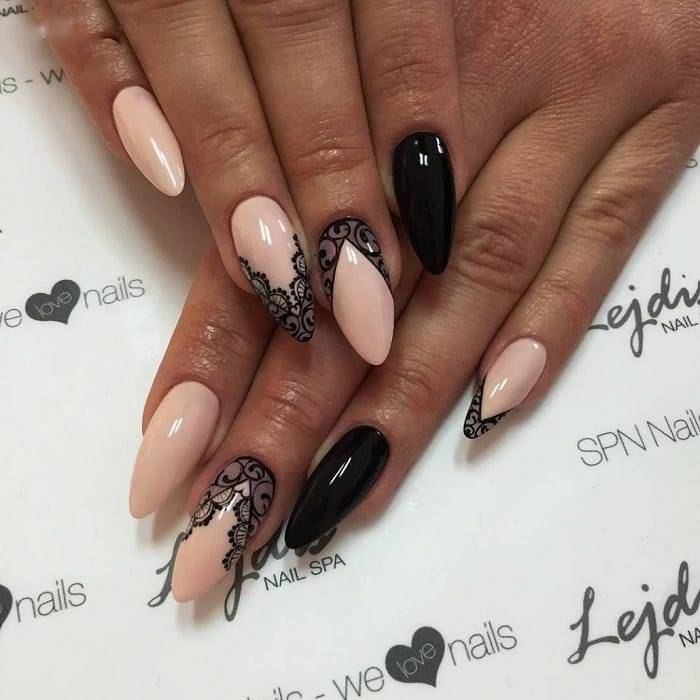 Бежевый дизайн ногтей на длинных ноготках с черным кружевом
