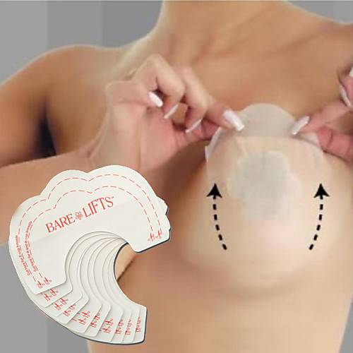 Если речь идет об очень открытой одежде, где лямки от бюстгальтера будут лишними, следует использовать специальные наклейки. Они хорошо держатся на коже и эффективно приподнимают грудь.