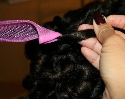 - При помощи крючка захватить ее у корней и протянуть сквозь бигуди.