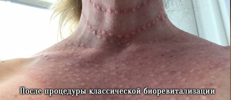 Специфика классической биоревитализации заключается в точечном введении микродоз препарата по всему периметру лица. На месте инъекций образуются своеобразные «шарики» (папулы), которые рассасываются часто на протяжении аж нескольких дней.