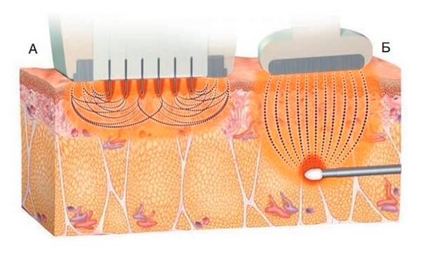Он нагревает жировую ткань до 70 °С и коагулирует (сокращает) субдермальную жировую ткань и, что важно, укорачивает горизонтальные, косые, вертикальные соединительнотканные волокна, идущие к коже, называемые ФСС (фибросептальная сеть). Благодаря этому обеспечивается значительное уплотнение мягких тканей и устранение вышележащих морщин, рубцов, неровного рельефа кожи, пор, даже растяжек и рубцов после угревой сыпи