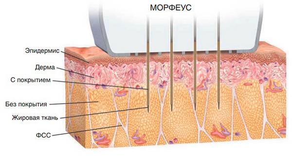 Наконечник Morpheus8 оснащен покрытыми силиконом игольчатыми электродами, вводимыми через кожу в поверхностную жировую ткань, располагающуюся непосредственно под кожей. Кончики положительно заряженных игольчатых электродов без покрытия высвобождают мощную RF-энергию, которая вызывает локальную коагуляцию жировой ткани и ее уплотнение, а также сокращение фибросептальной сети, соединенной с кожей. Сокращение жировой ткани и фибросептальной сети вызывают подтягивание кожи. Далее RF-энергия течет от кончиков положительно заряженных игольчатых электродов к поверхностным отрицательно заряженным электродам ромбической формы, через которые выступают игольчатые электроды. RF-поток, идущий к отрицательно заряженным внешним электродам, имеет мягкий, ненекротический характер и уплотняет дерму.