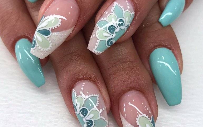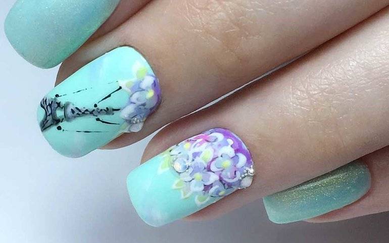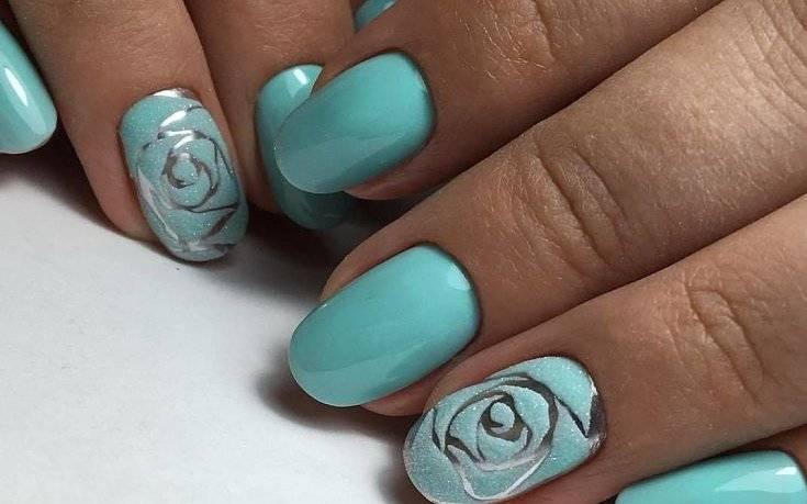 В зависимости от длины ногтей следует подбирать рисунки и узоры. Так, если ногти короткие, не стоит их все изрисовывать цветами — достаточно выбрать минимальный дизайн. Кроме того, для коротких ногтей лучше всего выбирать нежно-бирюзовые оттенки, а вот для длинных можно выбрать что-то потемнее.