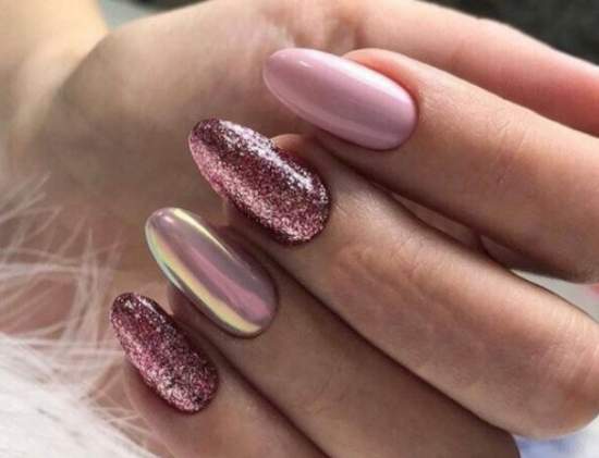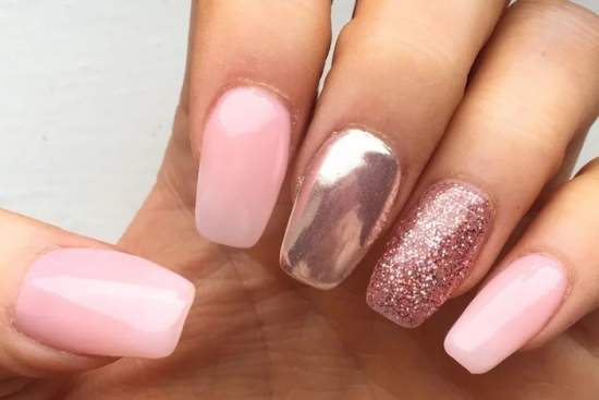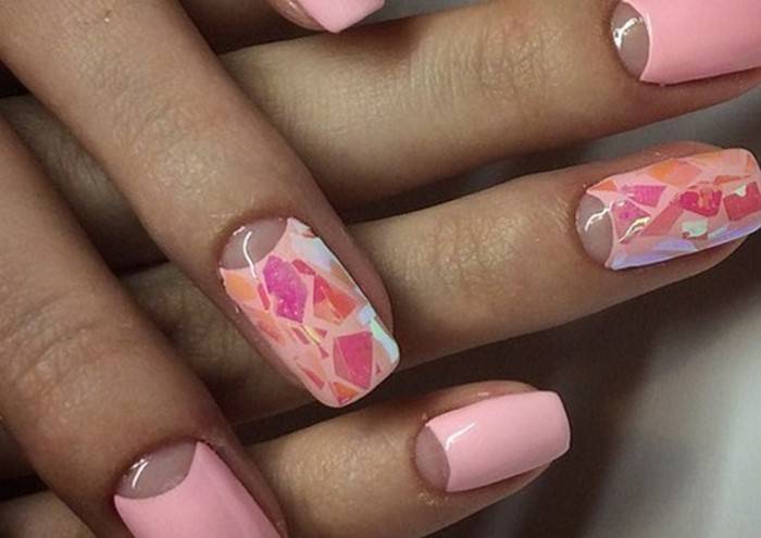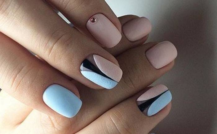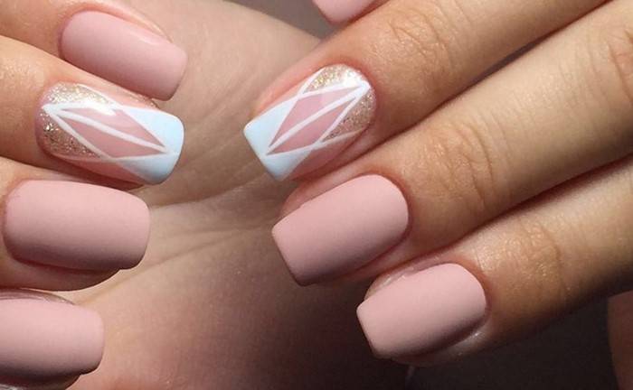 Интересно и утончённо смотрится следующий маникюр. Он является универсальным, так как в качестве основного выбран матовый розовый лак пастельного оттенка. Удачный акцент на отдельных ногтях — геометрический узор в виде белых полос, разделяющих пластинку на несколько частей: треугольники окрашены в нежно-голубой (верхние) и декорированы блёстками (нижние). Геометрические формы в середине ногтевой пластины остались бесцветными, благодаря чему нейл-арт получился особенно нежным и гармоничным.
