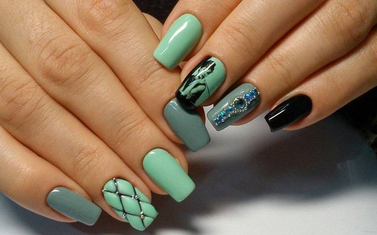 Несмотря на тенденции нейл-арта, зеленый маникюр довольно часто украшают стразами и камнями небольшого размера. С их помощью можно сделать имитацию ювелирных украшений, что смотрится невероятно красиво. Такое оформление выбирают преимущественно для праздничных мероприятий. Ведь маникюр становится настоящим украшением и одним из акцентов образа.