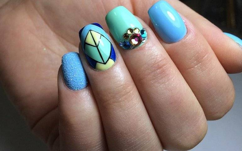 Стразы, рисунки и блестки на маникюре с бирюзовым фоном: фото 2022-2023