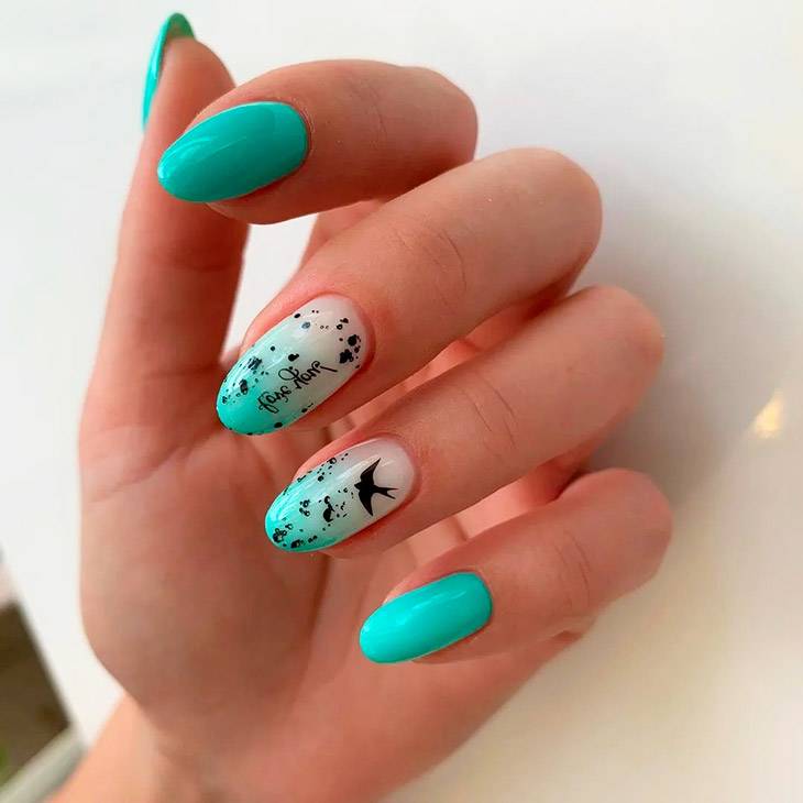 При выборе маникюра с рисунком часто используют флористические мотивы, но не менее интересно будут смотреться морские и мультяшные картинки. Оригинально смотрятся геометрические узоры, линии и полосы на бирюзовом фоне. В зависимости от выбранного оттенка, получится достигнуть разных эффектов. Добавив к бирюзовому цвету черную надпись, получится красивый концептуальный маникюр.