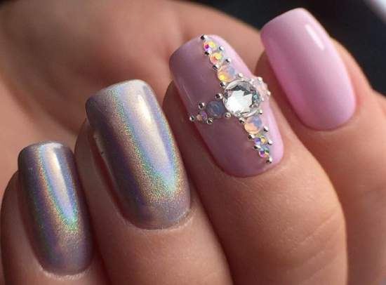 - пудра отлично сочетается с другим декором для нейл-арта, например, со стразами, фольгой, блестящими полосками;