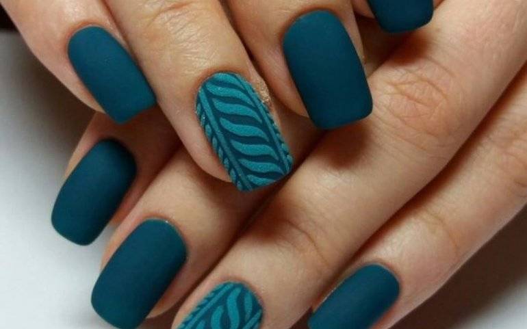 Бирюзовый цвет в сезоне 2022-2023 представлен как в зимних, так и в летних вариациях. Холодные оттенки в сочетании с белым создадут отличный новогодний маникюр, на одном или двух пальчиках уместно изобразить текстуру вязаного полотна.