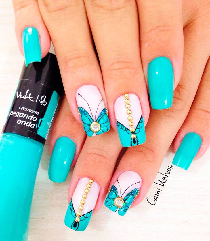 При желании такие ногти можно украсить стразами или дизайном в стиле 3D, для подчеркивания своей неповторимости. Помните, что золота много не бывает, поэтому не бойтесь украсить ваши бирюзовые ноготочки этим оттенком.