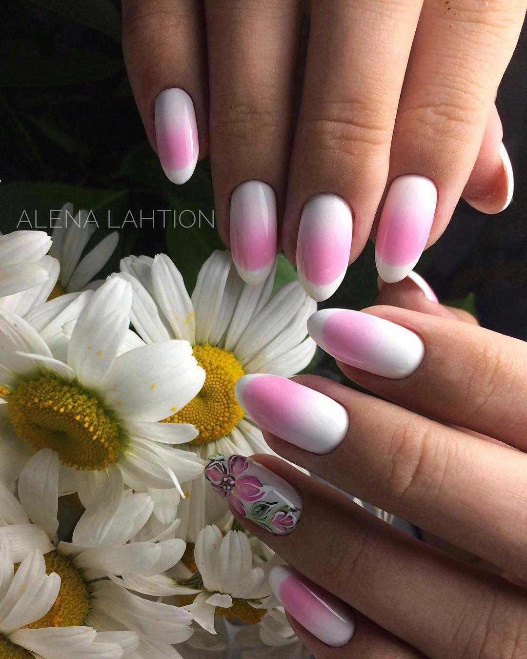 Контрастное оформление миндалевидных пластин в светло-розовой и синей гамме с геометрическим принтом на одном ногте и акриловым напылением на другом – превосходное решение для яркого события!