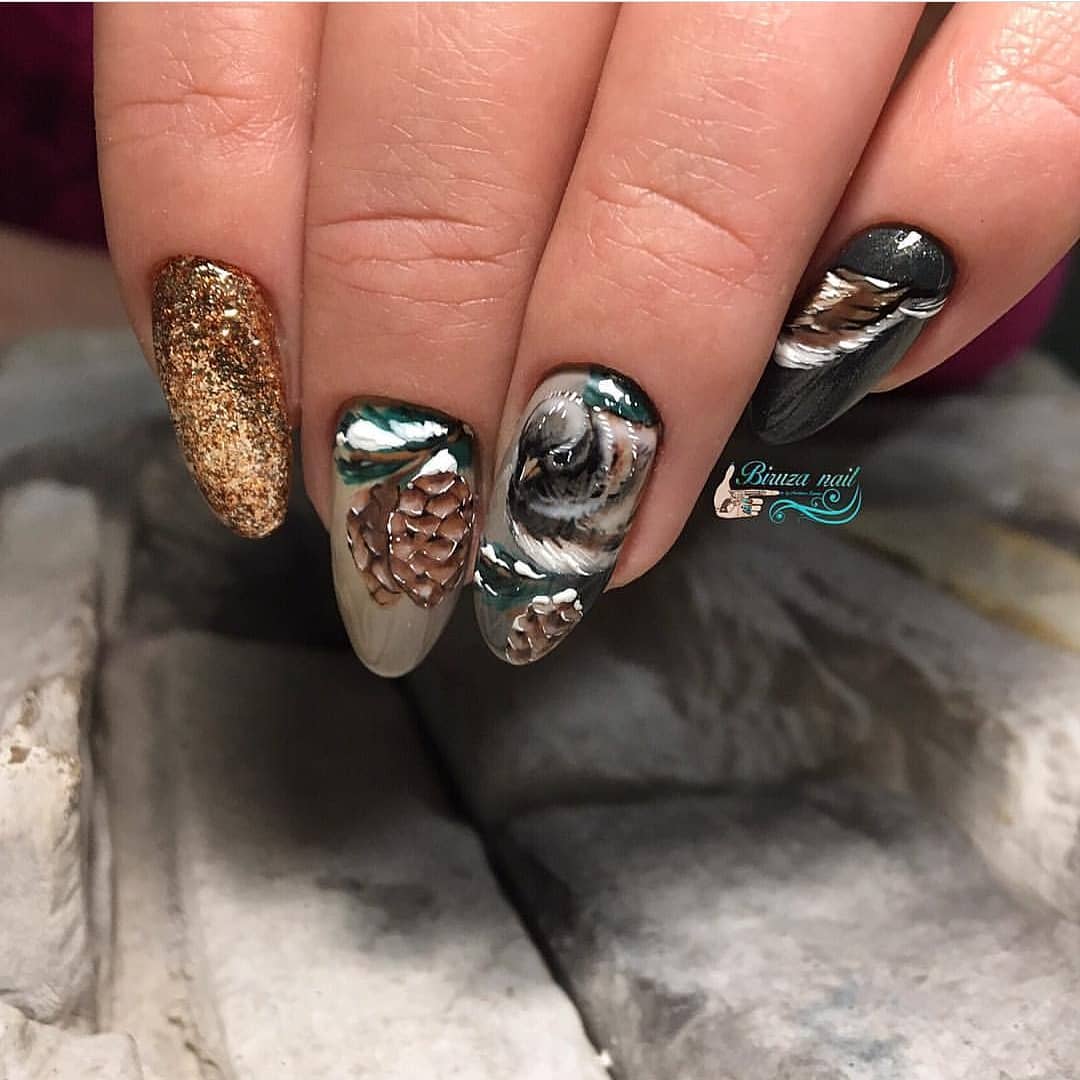 Даже если у владелицы ноготков нет художественного таланта, нейл-индустрия предоставляет шикарные возможности для необычного, атмосферного дизайна. В тренде «животные» принты с имитацией змеиной чешуи или леопардовой шкуры, морская тематика и авторские тематические сюжеты.