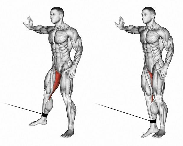 - Отведите ногу вбок к стойке. Не используйте силу инерции, движение должно выполнять в медленном, подконтрольном темпе.