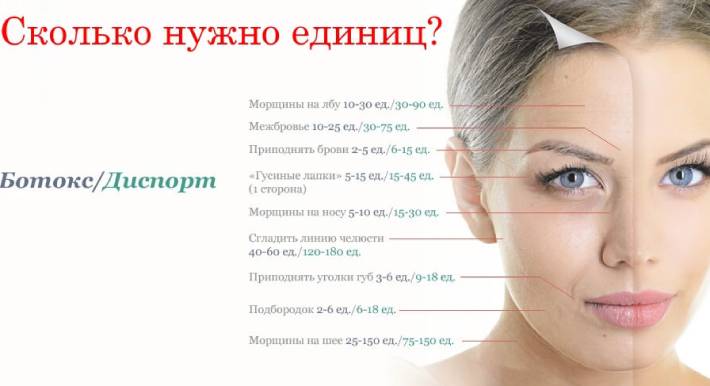 Для коррекции морщин на лбу потребуется до 8 уколов, в межбровной зоне – 3–4 инъекции, «гусиных лапок» около глаз – по 2–3 укола в каждый внешний уголок глаза. Объем вводимого вещества рассчитывается индивидуально, зависит от выраженности дефектов, глубины морщин, возраста пациента.