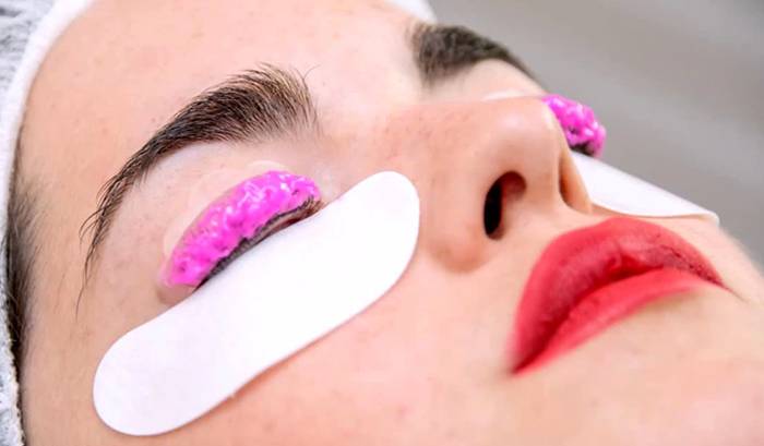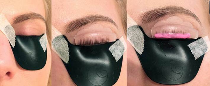 Весь сеанс проходит в несколько этапов: биозавивка, окрашивание и только потом нанесение ботокса. Нижнее веко покрывают специальным пластырем, на верхнее веко наносятся силиконовые валики, прикрепляя к ним ресничный ряд