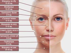 | Показания | Морщины у глаз, рта, на лбу, утрата четкости овала лица, неврологические патологии, вызванные спазмами мышц |