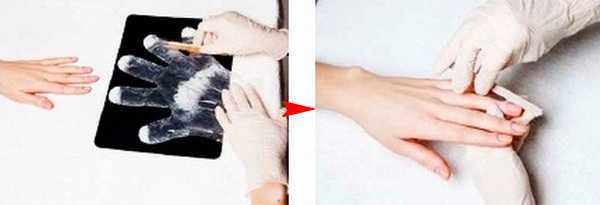 - После обработки последнего ногтя, перчатки снимаются, остатки крема втираются в кожу рук плавными массажными движениями. Остаток питательного состава удаляется с ногтевых пластин бумажным полотенцем.