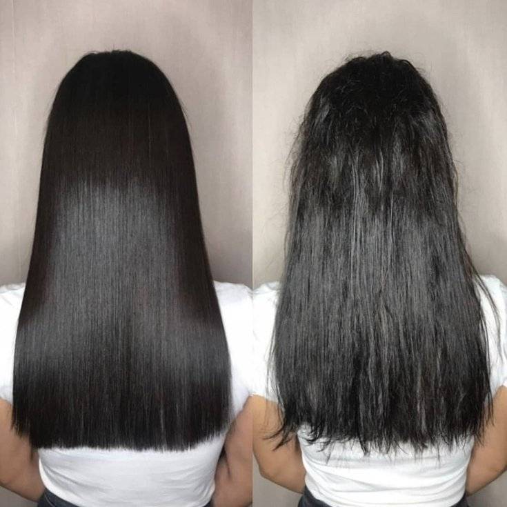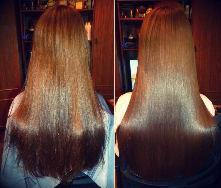 Блестят волосы после процедуры потому, что их лакируют сильно нагретыми силиконами, которые есть в составе этих средств. Силиконы никак не оздоравливают волос, а создают визуальный эффект лака. То есть волосы после этих процедур блестят тем же блеском, которым блестят золотые коронки, поставленные на изъеденные кариесом зубы.