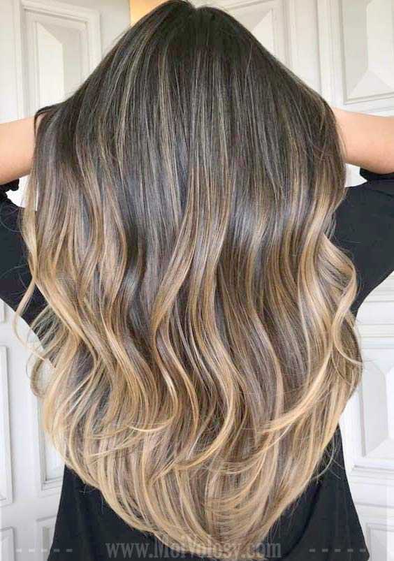 Техника предполагает мягкий плавный переход от темных корней к светлым кончикам. Получаются естественно выгоревшие локоны с переливами. Мастер делает несколько прядей, одну из них начесывает у корней. На кончики наносит светлый пигмент, а середину окрашивает в темный. Завершающий этап — растушевка.