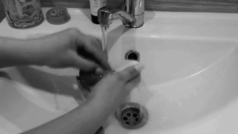 Чтобы помыть спонж мылом, аккуратно водите им с разных сторон по мылу под струёй воды. Затем слегка отжимайте. Так повторите несколько раз, пока при отжиме не будет течь чистая вода.