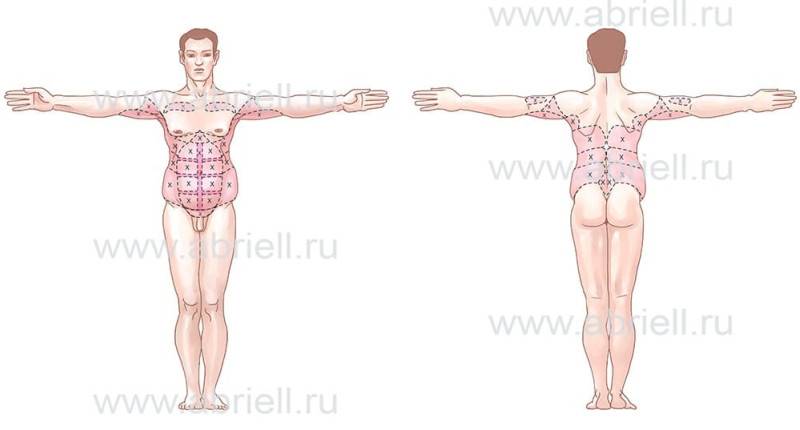 У мужчин запасы жира откладываются, в основном, в области живота и торса, но преимущественно жир наращивается в брюшной полости, и лишь минимально — в подкожной клетчатке. Что характерно, в области ног он совсем не откладывается, что, опять же, обусловлено мужскими гормонами — андрогенами.