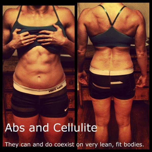 Мне помогли некоторые исследования, а также понимание структуры целлюлита. Факты и научные исследования показали нам, что целлюлит не заболевание или проблема людей с ожирением. Это нормально. На самом деле, вполне возможно быть очень худой, очень стройной и атлетичной и всё равно иметь целлюлит. Для этого я представляю вам изображение ниже. Моё тело гладкое спереди (видны мышцы живота) спереди и целлюлит сзади. Если вы не смеётесь сейчас, вы, должно быть, пропустили 80-ые. Пусть кто-нибудь объяснит для вас выражение “hockey hair”. Я не говорю, что я рельефная, нет. Я просто стройная (хотя ямочки всё ещё остаются). Но я в форме. Я ем здоровую пищу. Я сильнее, чем когда-либо в своей жизни. Я вижу свой пресс. И у меня целлюлит.