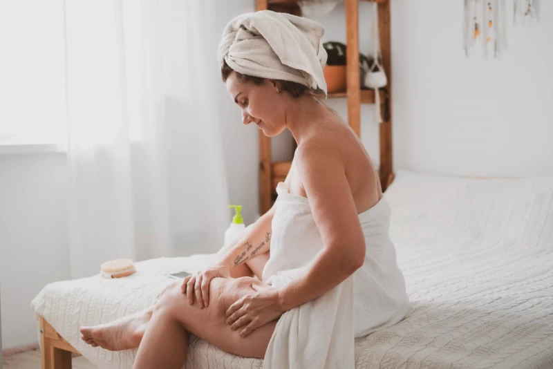 При принятии душа или ванны нужно постоянно растирать проблемные зоны на теле жесткой мочалкой, рекомендуется использовать скрабы, от целлюлита хорошо помогает медовый массаж.