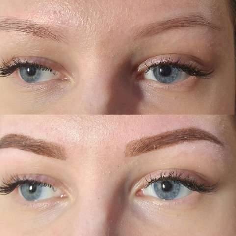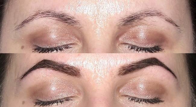 Краска, в большей степени, окрашивает волоски, лишь немного задевая кожу под бровями. Если краска и остается на коже бровей, то буквально на несколько дней. Таким образом, с использованием краски достигается достаточно естественный эффект. Соответственно, окрашивание краской больше подойдёт девушкам со светлыми бровями при нормальной густоте волосков.