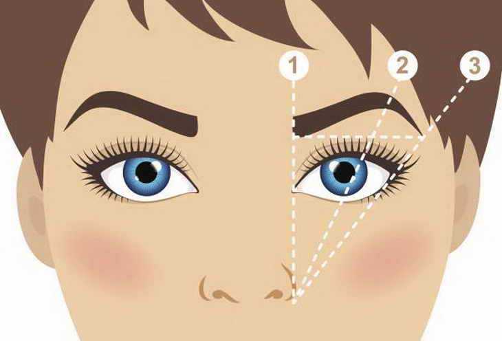 - Опустите кисть так, чтобы один конец упирался в крыло носа, а другой «проходил» через внешний угол глаза. Там, где кисть пересечется с бровью, и должно быть ее окончание.