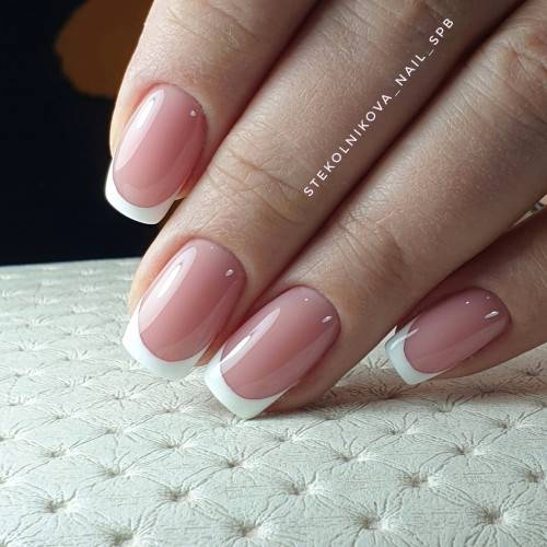 - Французский маникюр (двухцветный: классическое сочетание белого с розовым либо бежевым тоном; вне классики – тоже двухцветный, но сочетают контрастные тона). Последовательность нанесения:
