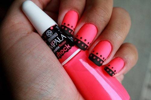 - Рисунки: геометрические формы, линии, фрукты (ягодки, клубничка, другие), различные символы (сердечка, смайлики). На подготовленные пластины (с двумя слоями однотонного покрытия) наносят узор контрастными цветами других лаков.