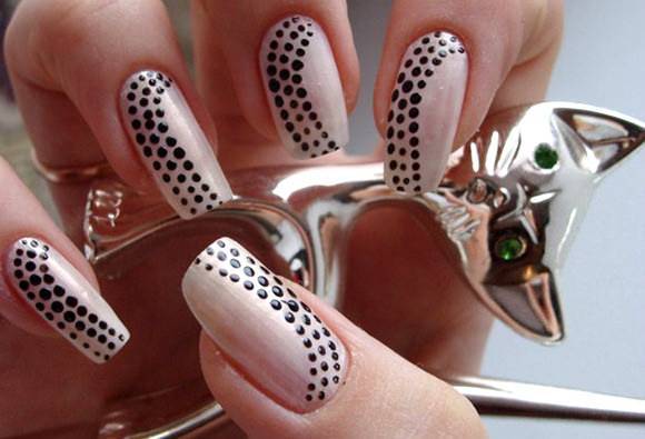 3. Кисточкой или другим инструментом рисуем пятна. Кончик обмакиваем в лак и в любом порядке расставляем их по поверхности ногтей. Следует отметить, что пятна не должны быть одинакового размера и идеально круглые. Неровные края рисунка придают ему естественности.