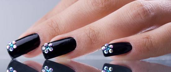 • Стразы. Чем короче ноготки, тем меньшего размера должны быть стразы. Современный рынок предлагает большое разнообразие форм, размеров и цветов блестящих камушков.
