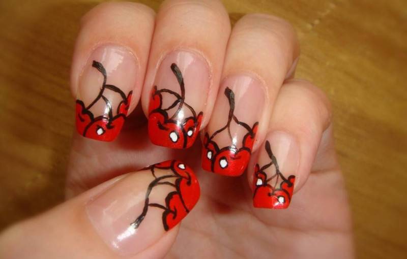 - Накрасьте ноготь красным цветом. Макните специальную кисточку для рисования на ногтях в черный цвет лака и рисуем в уголке ногтя две выпуклые линии