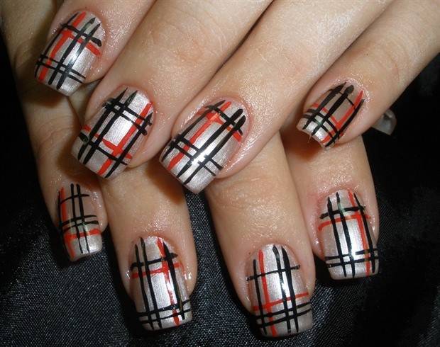 - Контрастная сеть (чёрный/белый, бежевый/коричневый, чёрный/красный, другие сочетания). Поверх высохшего готового покрытия одного цвета наносят линии другим лаком в виде решётки, ромбовидной сетки.