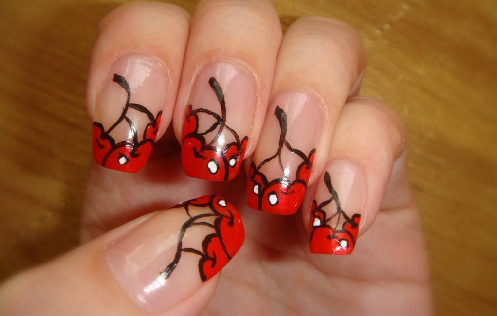 - Накрасьте ноготь красным цветом. Макните специальную кисточку для рисования на ногтях в черный цвет лака и рисуем в уголке ногтя две выпуклые линии