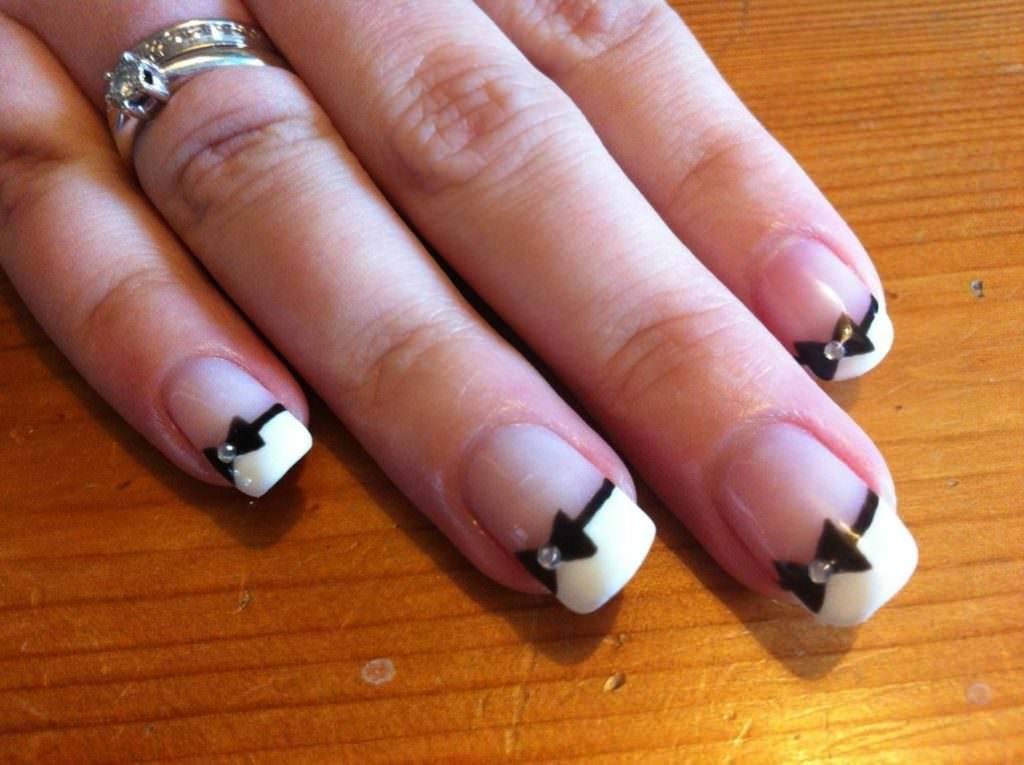 - Французский маникюр (двухцветный: классическое сочетание белого с розовым либо бежевым тоном; вне классики – тоже двухцветный, но сочетают контрастные тона). Последовательность нанесения: