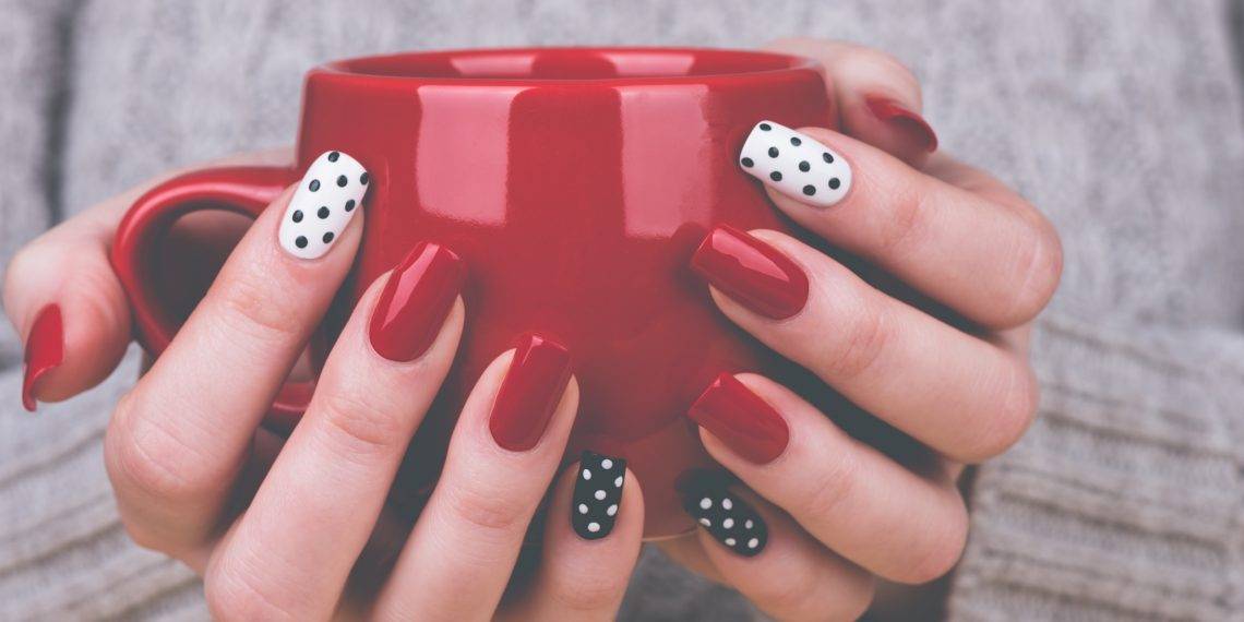 - Выберите три контрастных цвета лаков для ногтей: красный — базовый, и черный с белым для декора