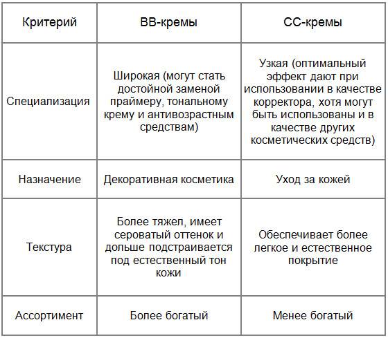 Разница между BB и CC-кремами менее ощутима и нагляднее всего прослеживается при помощи таблицы.